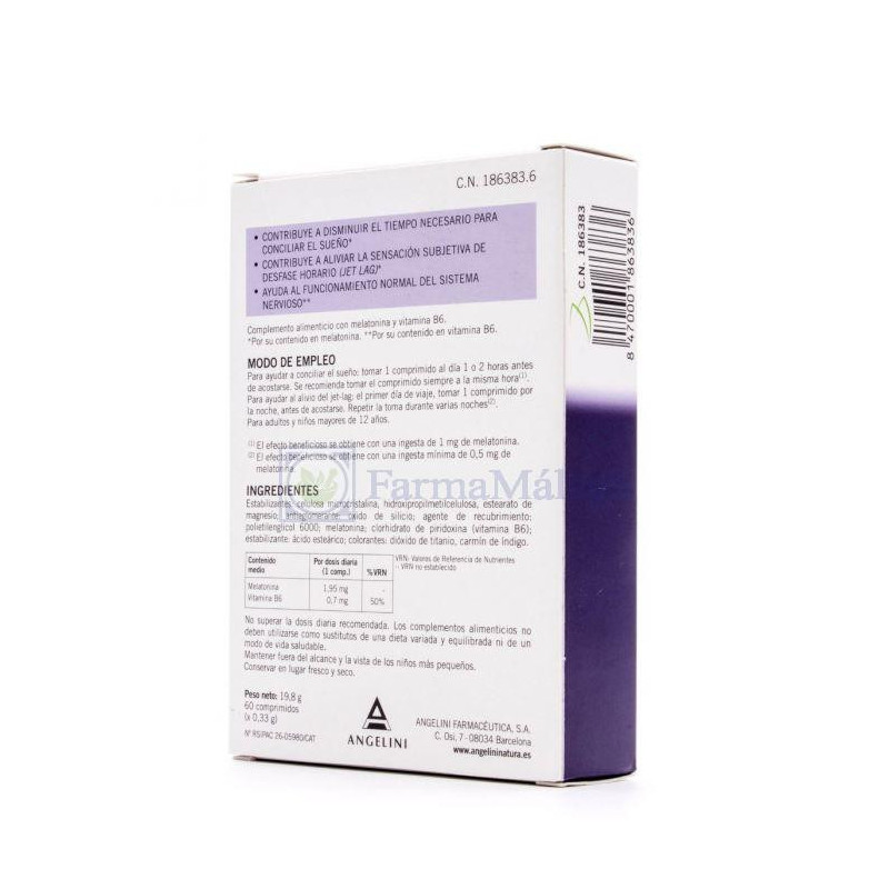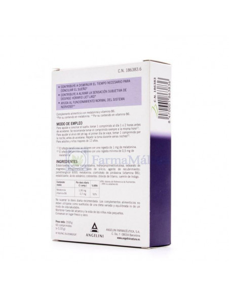 Estabilizantes (celulosa microcristalina, estearato de magnesio), antiaglomerante (óxido de silicio), estabilizante (hidroxipropilmetilcelulosa), melatonina, estabilizante (celulosa microcristalina), colorante (dióxido de titanio), clorhidrato de piridoxina (vitamina B6), colorante (carmín de índigo).