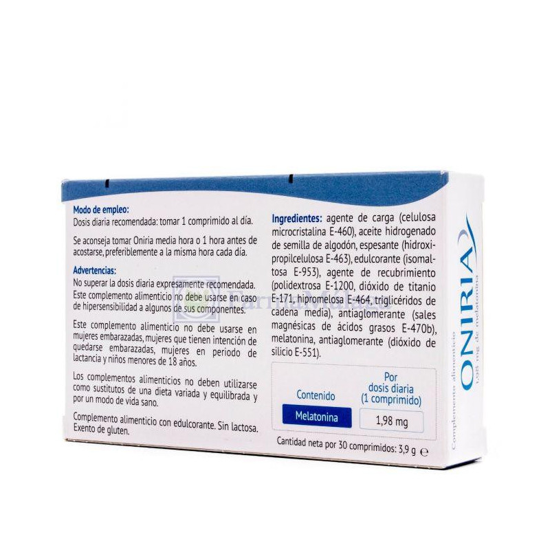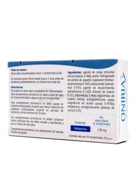Agente de carga (celulosa microcristalina (E-460), antiaglomerante: sales magnésicas de ácidos grasos (E-470b), melatonina, antiaglomerante: dióxido de silicio (E-551); agente de carga: hidroxipropilmetilcelulosa (E-464).